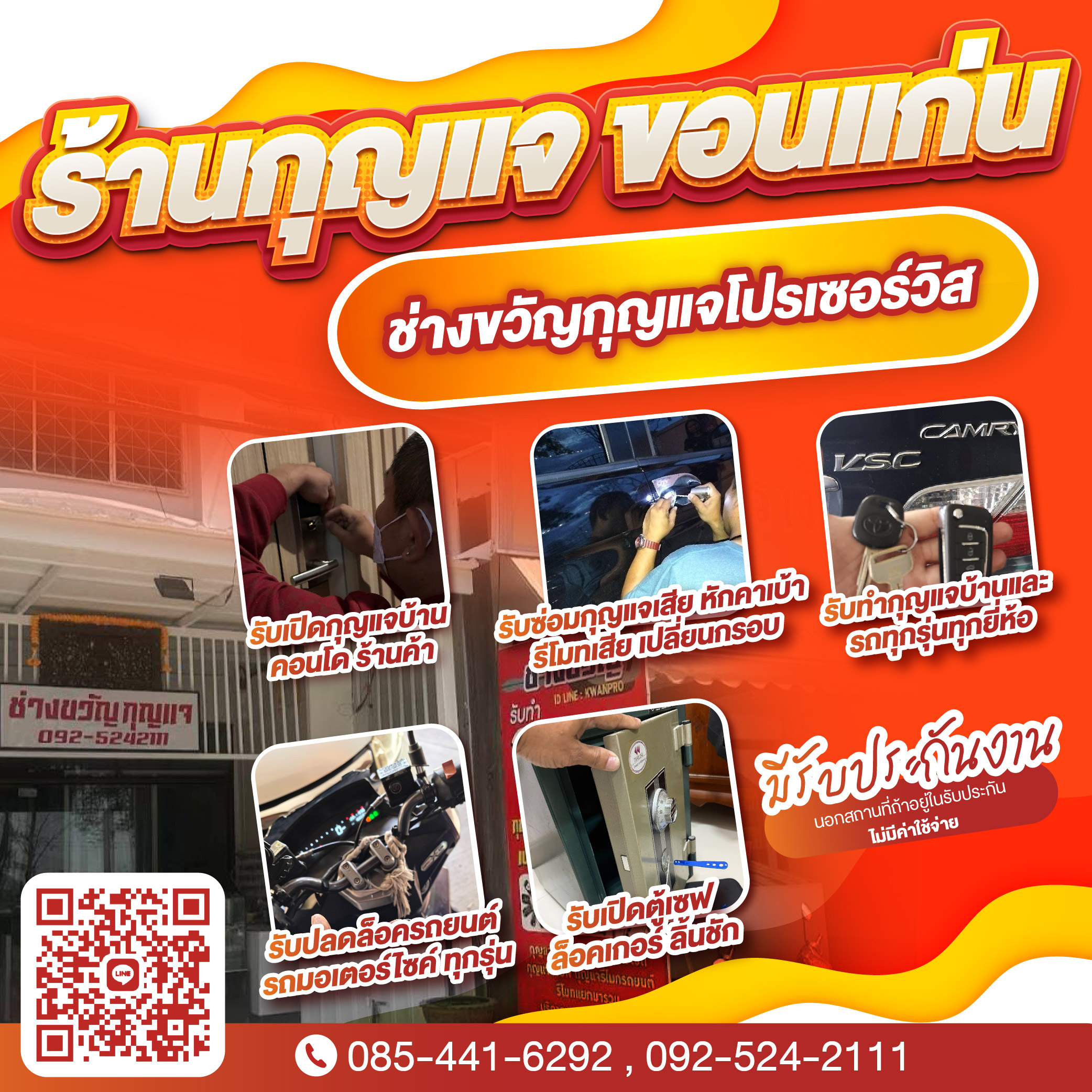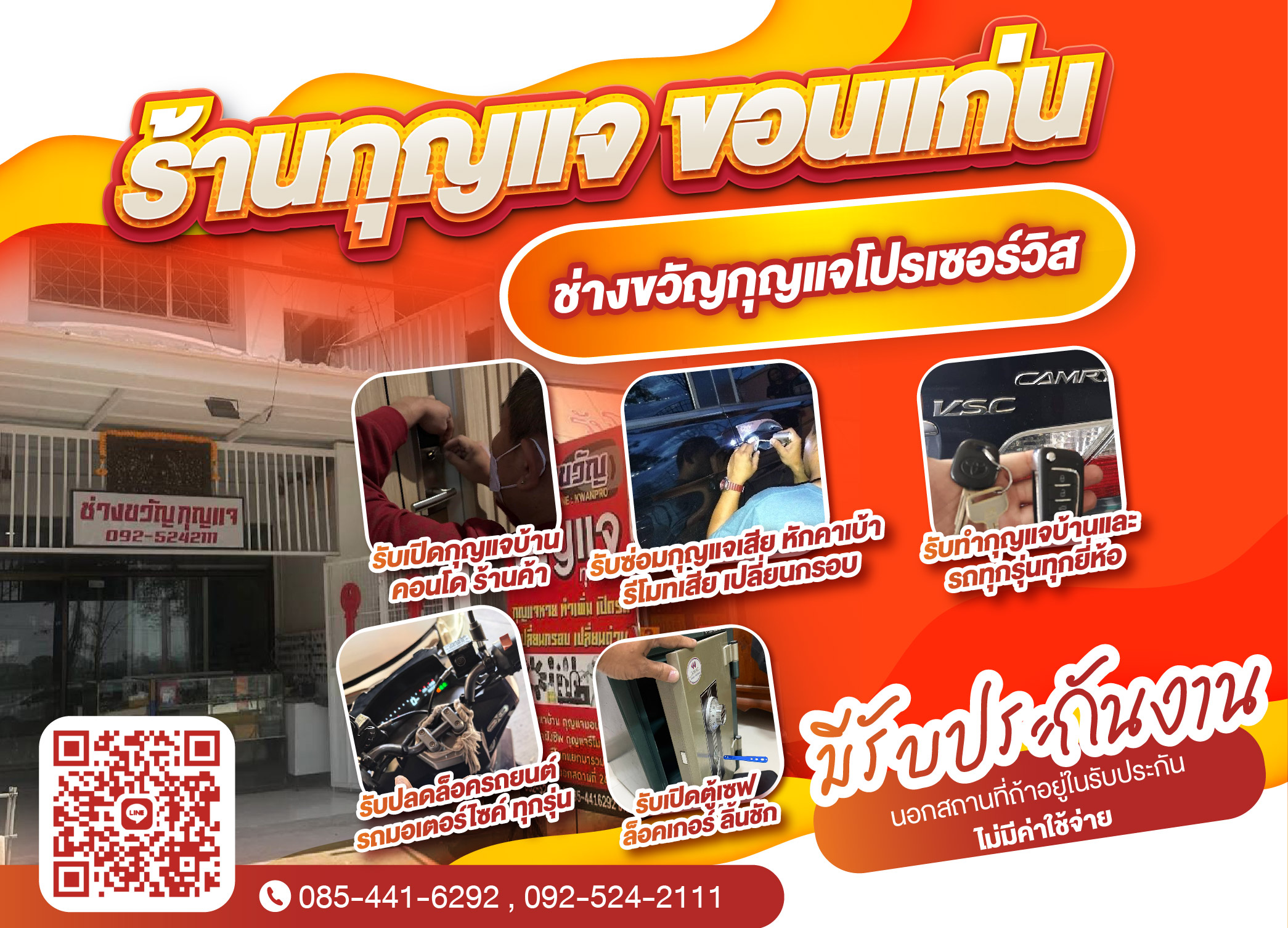 รับทำกุญแจขอนแก่นทั้งในและนอกสถานที่ จากช่างที่มีประสบการณ์ มีหลายสาขา เปิดบริการมามากกว่า 20 ปี ช่างขวัญกุญแจโปรเซอร์วิส-ขอนแก่น รับทำกุญแจทุกชนิด ไม่ว่าจะเป็น กุญแจรีโมท สมาร์ทคีย์กุญแจ Keyless , เปลี่ยนถ่านรีโมท, รับซ่อมกุญแจเสีย กุญแจหักคา กุญแจรถไขไม่ได้, รับเปลี่ยนกรอบกุญแจทั้งรถยนต์และมอเตอร์ไซต์ทุกรุ่นทุกยี่ห้อง และบริการเปิดบ้าน เปิดรถ เปิดตู้เซฟ ราคาประหยัด งานมีคุณภาพ พร้อมบริการตลอด 24 ชั่วโมง